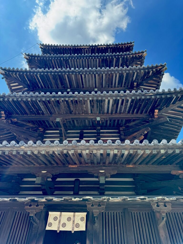 日本最古の塔である五重塔は、五重目の軸部が初層の半分の大きさになっており、これに深い軒の出が相まって安定感を与えています。その軒を雲肘木が優しく支えて、見る人を飽きさせません。