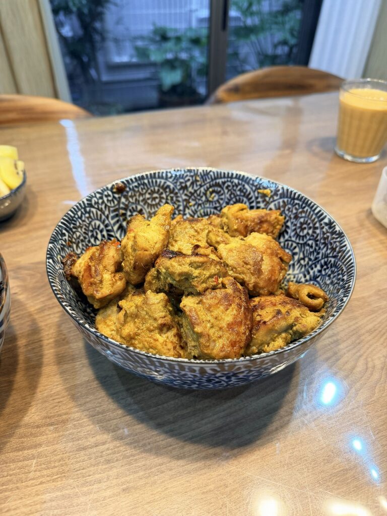 これは鶏もも肉を家の中にある香辛料とカレー粉を適当に入れ、豆乳ヨーグルト・ニンニクなどを入れて一晩冷蔵庫に。