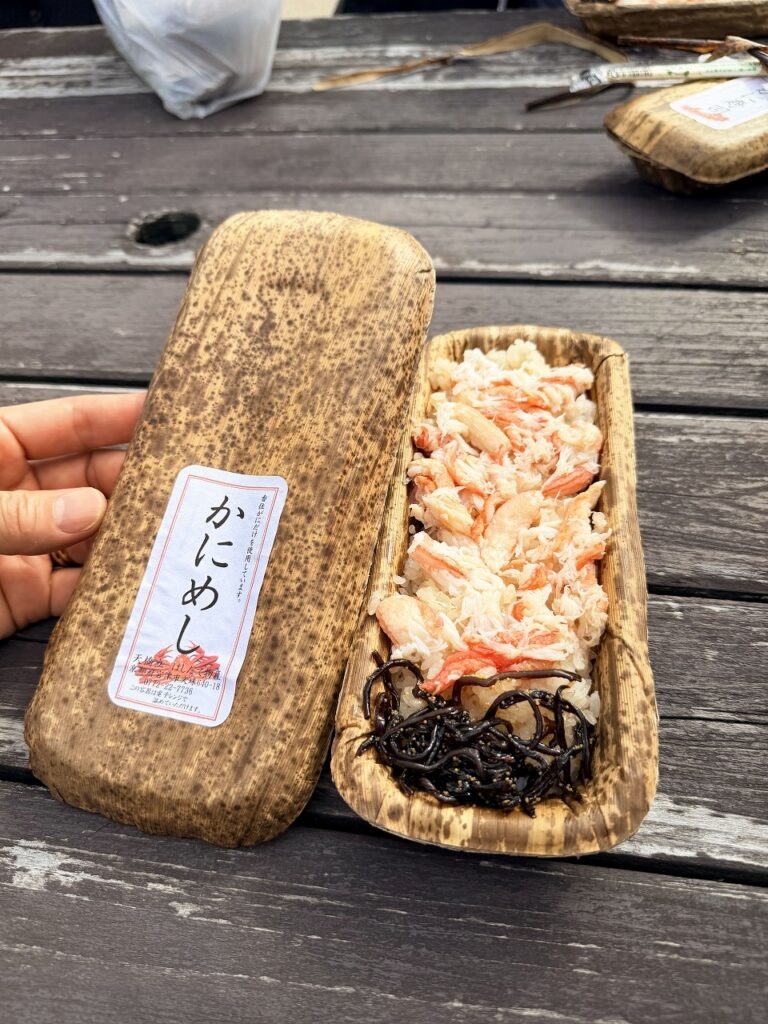 そしてこちらも事前に調べていたカニ飯のお店、はしだて物産。お弁当を買いました。カニ食べたいやん!