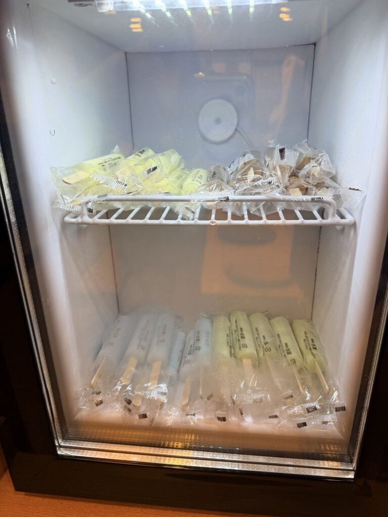 大浴場の湯上りにはジュースとアイスクリームが置いてあった。私は手を付けてませんよ!昔やったらむっちゃ食べてたと思う。私も大人になったもんだ😁