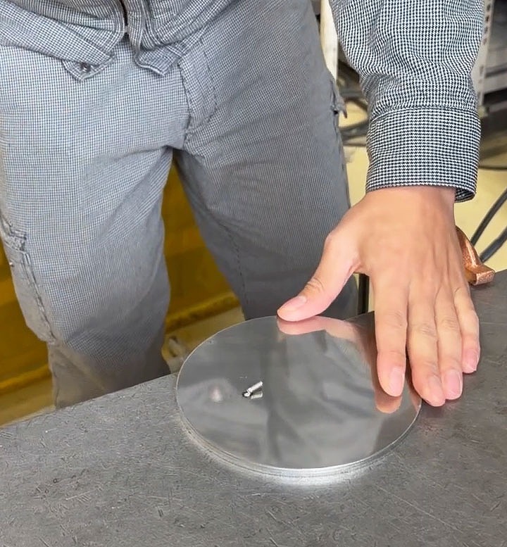 この機械って何かというと、寸切りネジを板に圧着溶接して建てる事が出来るんですよ。これが無かったら溶接で取り付けるしかないですからね。歪が大きくなるんですよ。でも、これなら低歪で綺麗に溶接が出来ます。