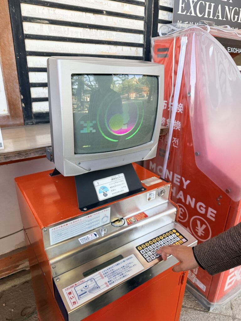 御朱印帳を満足げに眺めていると嫁さんが「コイン買お!」と言いながらお金を投入しているんです。