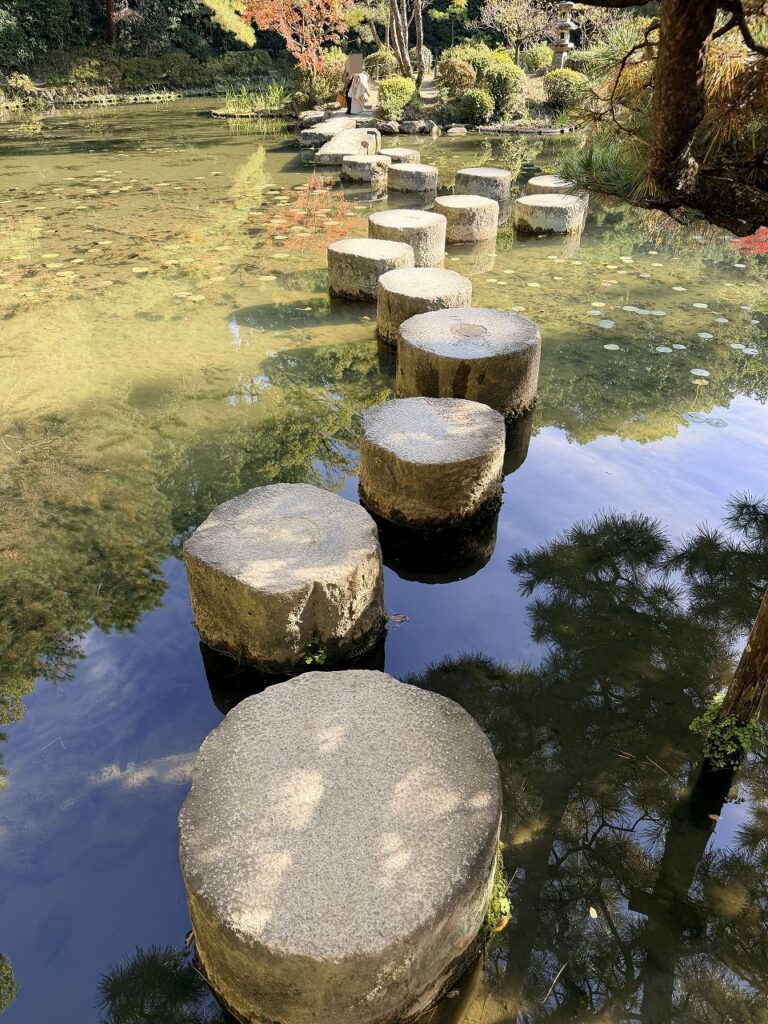 これ臥龍橋で、池を渡れるんですよ。嫁さんギャーギャー言いながら渡ってました。私がへまをするのを待ち構えて向こうで動画撮ってました。
