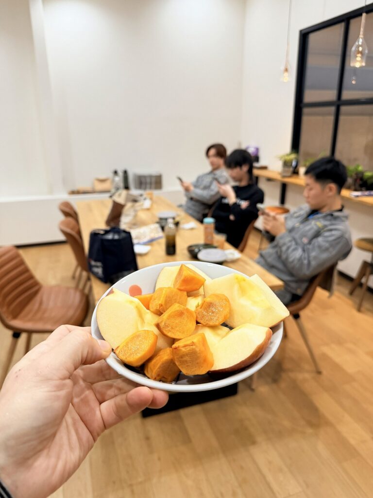 そうすると、ほぼみんな食事は終わっている。慌てて果物を切ってテーブルへ!