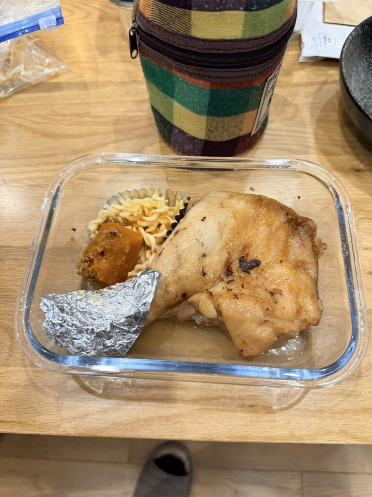 そしてお昼!お弁当をあけると骨付き鶏ももが一本入っていた。